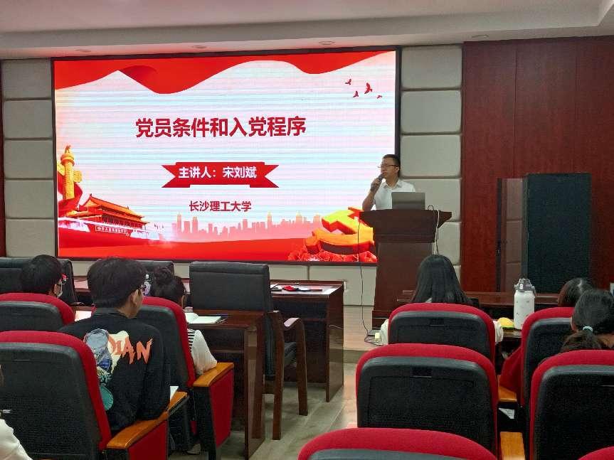 宋刘斌老师以“怎样成为一名党员和成为一名什么样的党员”的问题为切入点。从党员的基本条件、成为党员的基本准则、党员的权利义务三个方面展开论述。首先,在一段《中国共产党国际形象》宣传片放映结束后,宋刘斌老师详细阐明了申请成为一名合格的共产党员需要具备的主观条件和客观条件。其次,宋刘斌老师以亲身经历为例,详细论述了要成为一名优秀中国共产党员必须贯彻和落实的“三个精神”,即为人民服务、人民至上的精神;迎难而上、攻坚克难的精神;求真务实、勇于创新的精神。宋刘斌老师深入浅出,用学生喜闻乐见的教育方式将自己的扶贫事迹娓娓道来,教育和引导全体学员认识到中国共产党人的责任和担当。最后,宋刘斌老师从讲政治的高度详细解读了作为中国共产党党员应该具备的八项义务。特别指出学习是共产党员的首要义务,奉献是共产党员的主要义务。
