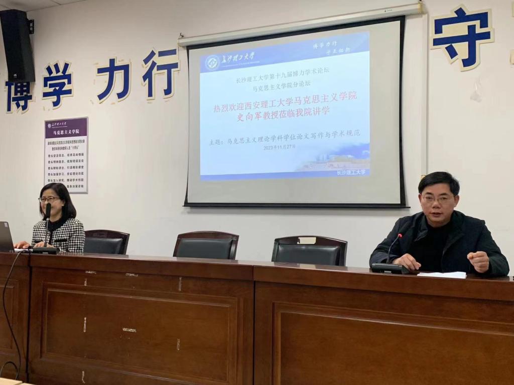 11月27日下午,全国高校马克思主义理论学科研究会理事、西安理工大学马克思主义学院教授、博士生导师史向军教授莅临第十九届博力学术论坛马克思主义学院分论坛,开展了题为“马克思主义理论学科学位论文写作与学术规范”的讲座,讲座由张明海院长主持,在云塘校区文科楼C203室进行,马克思主义学院副院长王威峰与学院研究生参加了本次讲座。