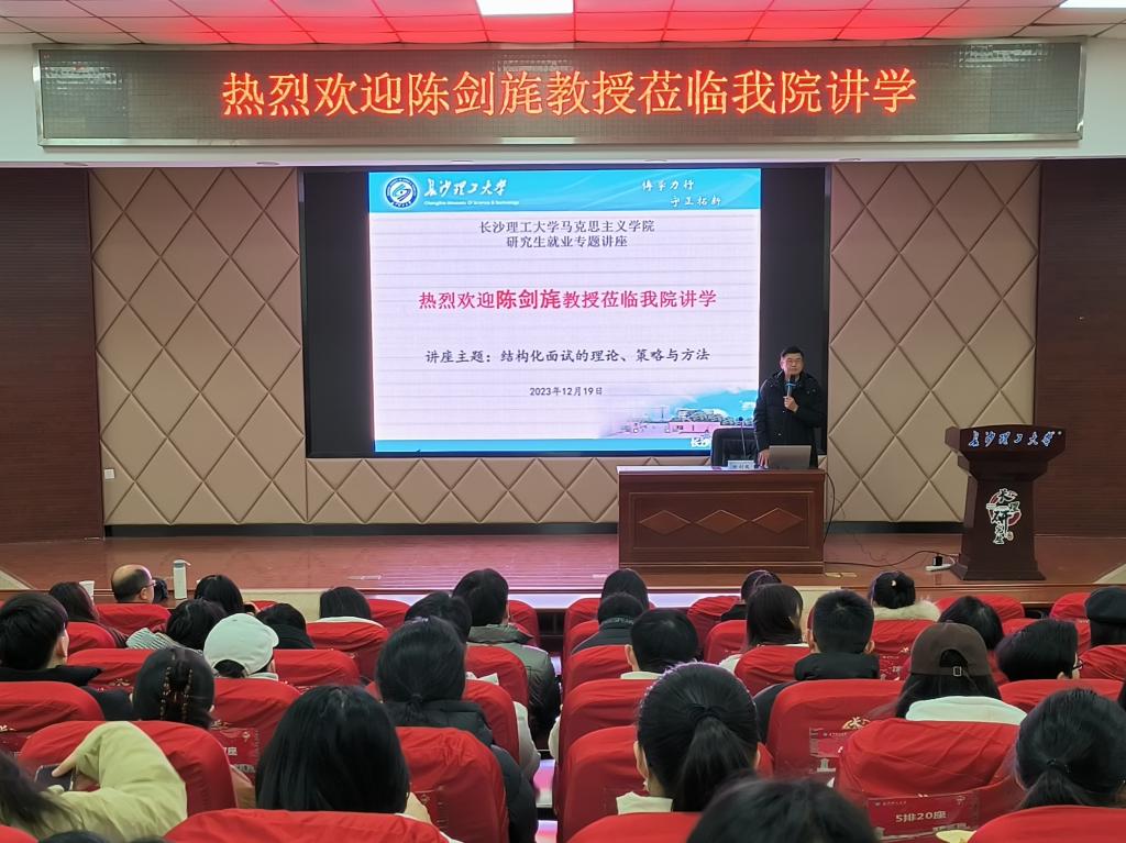 12月19日下午,湖南信息职业技术学院原院长陈剑旄教授应邀来到马克思主义学院,在云塘校区文科楼A200报告厅作了题为“结构化面试的理论、策略与方法”的就业专题讲座。本次讲座由院党委书记陈万球教授主持,院长张明海教授、副院长李雨燕教授以及我院研究生150多人参加了讲座。