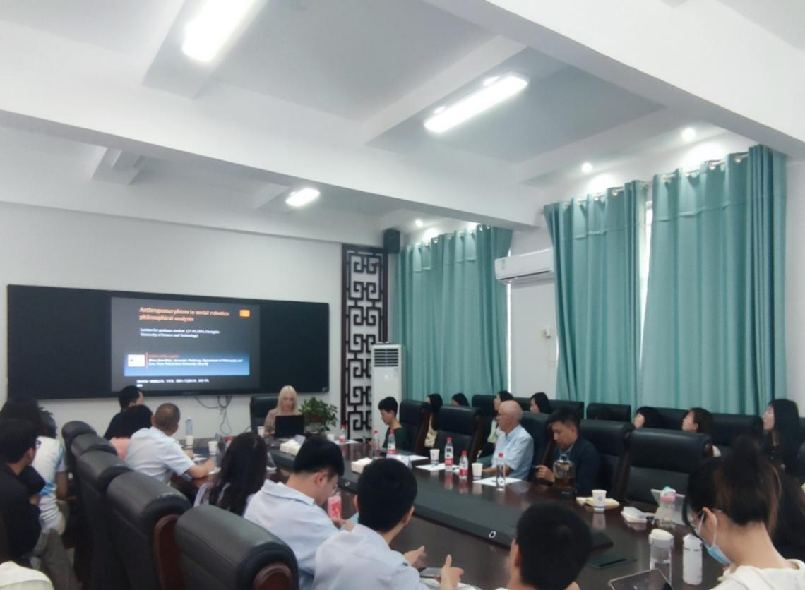 4月27日下午,俄罗斯联邦彼尔姆国立理工大学(Perm National Research Polytechnic University)Elena Seredkina(白雪)教授来到马克思主义学院,在必赢官网云塘校区文科楼B602会议室作了题为“社交机器人拟人化的哲学分析”的学术讲座。本次讲座由马克思主义学院文贵全副院长主持,余乃忠教授、陈芬教授、蒋显荣教授、廖苗副教授、郭蓉博士等学院部分教师和马克思主义学院2023级哲学、公共管理专业研究生近50人聆听了讲座。此外,广西科技大学黄磊助理教授也参加了本次讲座。