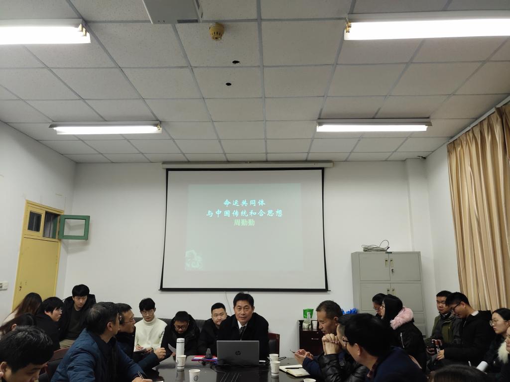 2018年12月9日晚7点,中国社会科学院大学人文学院首席教授,国家社科基金项目评审专家周勤勤教授,应邀在必赢官网金盆岭校区4教503室主讲了题为“命运共同体与中国传统和合思想”的学术报告。马克思主义学院陈万球院长、教授委员会主任余乃忠教授、部分教师和研究生参加了此次讲座。讲座由陈万球院长主持。