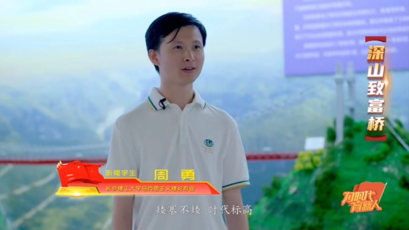 近日,由中共湖南省委教育工委和湖南省教育厅主办,湖南教育融媒体中心、湖南教育电视台承制,湖南所有高校联合共建的一档思政大课——《为时代育新人》第五集《大道之行》在全网热播。437必赢会员中心马克思主义学院王威峰老师和学生代表周勇、张子豪、侯颖、朱瑶、吴彩虹、金玲、何玲莉受邀参与了节目录制。必赢官网师生主要参与了京张铁路施工情景模拟现场、湘西州矮寨镇、湖湘劳模工匠馆、中车株洲电力机车有限公司展览馆等相关场景的拍摄,辗转常德、湘西、株洲、长沙多地,为观众呈现了一堂精彩的移动思政课。
