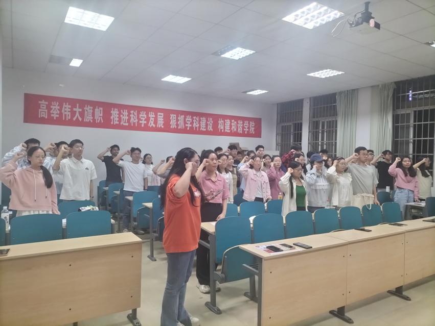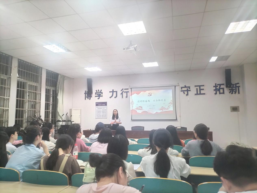 曾蓓老师以“预备党员为什么要有预备期”的问题为切入点,从接收新党员要有预备期、预备党员在预备期间需要注意的几个问题、预备党员转正程序、党员的教育管理四个方面展开讲解。首先,曾蓓老师详细阐明了申请成为一名合格的共产党员需要经过的5个阶段和25个步骤,并回答了预备党员为什么要有预备期的问题。然后,曾蓓老师详细说明了预备党员在预备期需要注意入党时间、预备期、党龄计算和党费缴纳等相关事项。再次,曾蓓老师向同学们详细介绍了预备党员的转正程序,尤其强调了提交转正申请书的注意事项,使全体学员提前了解了预备党员转正申请书的提交时间以及规范格式等。紧接着,曾蓓老师指出作为中国共产党党员应该了解党员的教育管理,党员教育管理是基层党组织的一项重要工作内容,是党建工作的重要组成部分,它对提高党员队伍的素质起着极其重要的作用。最后,在曾蓓老师的带领下,班长曾永慧担任领誓人,全体学员面向党旗庄严地重温入党誓词,铿锵恢弘的誓词表达了大家永葆初心使命,为共产主义奋斗终身的坚定信念和决心。