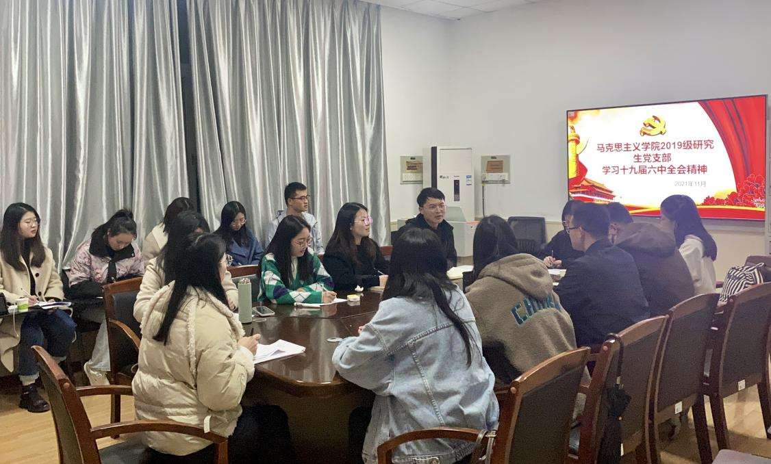2021年11月23日晚上,马克思主义学院2019级研究生党支部在金盆岭校区4教501教室组织集中学习党的十九届六中全会精神。本次学习由2019级党支部书记李袁远主持,刘欣伟同志领学,2019级全体党员和预备党员参加。