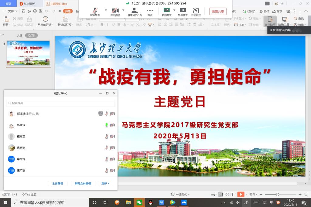 5月13日中午,马克思主义学院2017级研究生党支部开展线上主题党日活动,围绕“战疫有我,勇担使命”主题,在学习总书记抗疫指示精神和对于青年责任的讲话基础上,分享如何在抗疫期间,勇担使命方面自己的感悟。活动由邓深林主持,焦浩源、申军辉等5名正式党员及付荣、胡哲峥等9名预备党员参加。