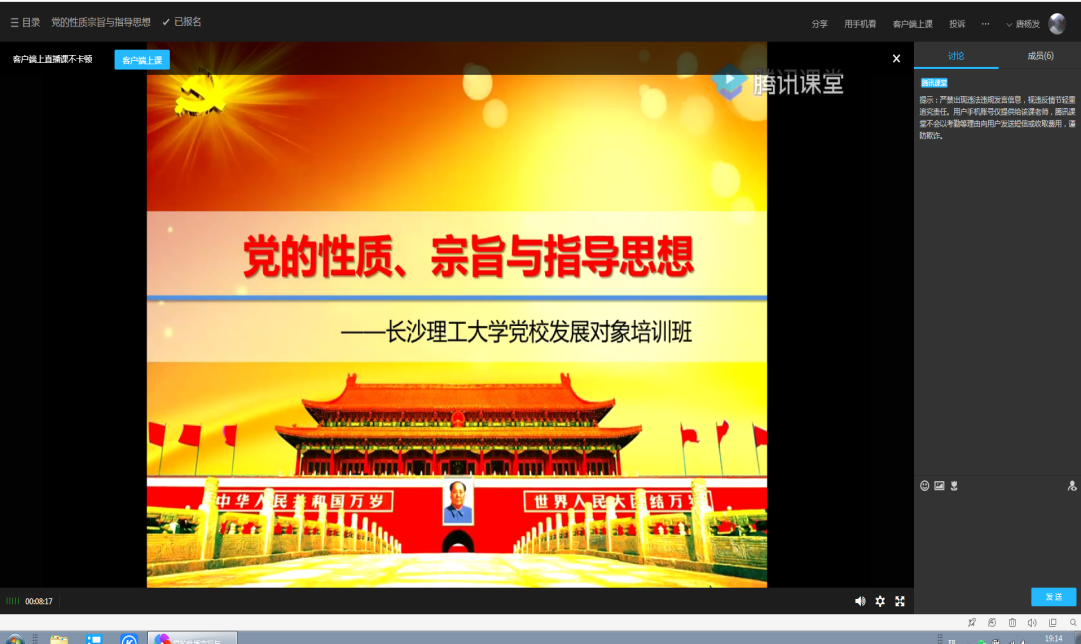 4月20日晚7:30,研工部部长田上通过线上平台给2020年上期党员发展对象培训班教授了《党的性质、宗旨与指导思想》一课,让新一批党员发展对象深刻认识“中国共产党是什么样的党、党为了什么、党的行动指南是什么”。