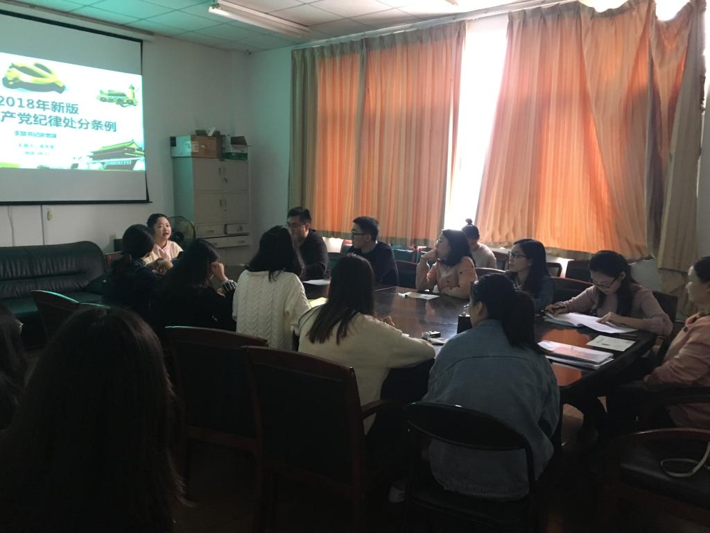 支部书记易芙蓉主要从三个方面带领大家进入学习。她首先阐述了纪律处分条例制定的意义及要求,认为新《中国共产党纪律处分条例》的颁布实施,是党在新的历史时期从严治党、加强党的建设的重大举措,是党的纪律建设进入科学化、规范化新阶段的重要里程碑,对于维护党纪处分的权威性、严肃性和统一性,具有重要的意义。随后,她从“一个思想”、“两个坚决维护”、“三个重点”、“四个意识”“四种形态”、五处纪法衔接、六个从严、“七个有之”以及八种典型违纪行为等方面向大家展示了新条例的八大亮点,并详细解读了新条例的具体内容;最后对于怎样认真执行新“条例”,易芙蓉指出,我们既要广泛深入学习宣传,明确方向,也要准确把握精神实质,落实责任,更要坚定自觉遵守执行,从现在做起、从小处着眼,真正把纪律立起来、紧起来、严起来。