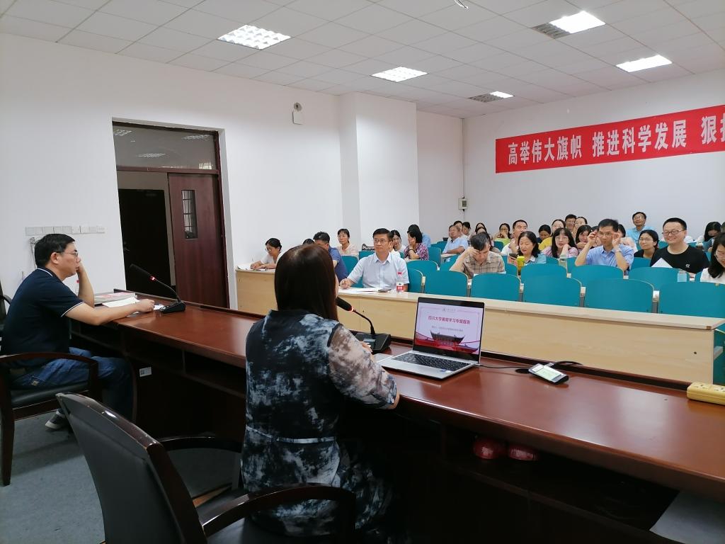 暑假期间,根据学校安排,我院教学副院长郭华在四川大学全国干部教育培训基地进行了为期一周的“437必赢会员中心教学管理与教学创新专题干部研修”。为让研修成果辐射更多老师,2023年9月5日,星期二下午,学院召开全院大会,郭华副院长做了题为“以学生为中心 讲好立德树人关键课程”的暑期学习专题报告。