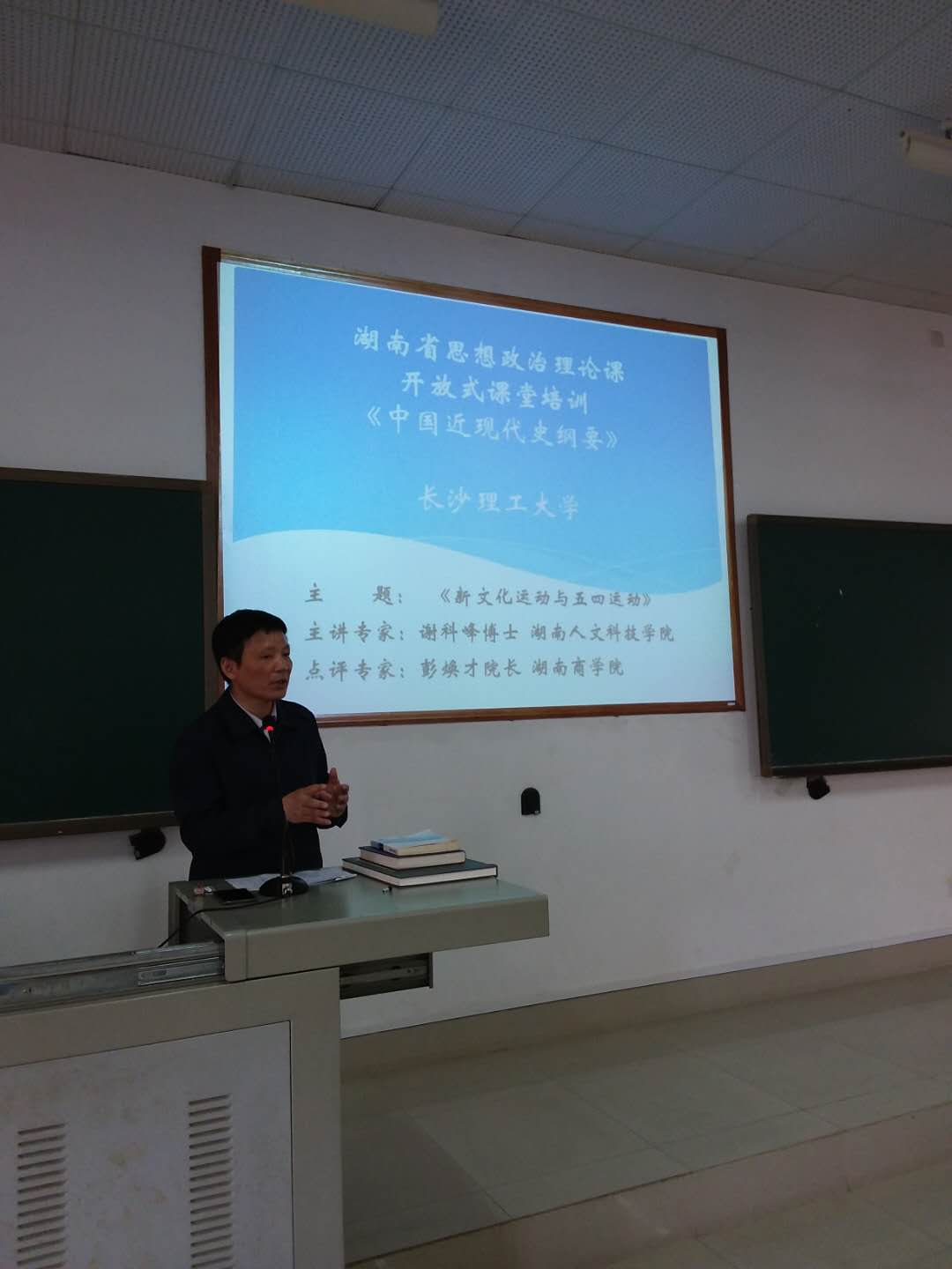 4月19日下午,由湖南省委教育工委组织、必赢官网承办的《中国近现代史纲要》开放式课堂第二课在云塘校区综合楼举行。此次开放式课堂由来自湖南人文科技学院马克思主义学院的谢科峰博士讲授,437必赢会员中心马克思主义学院副院长梁建新教授主持,湖南商学院马克思主义学院院长彭焕才教授点评。来自湖南师范大学、湘潭大学、湖南农业大学等省内30多所高校的40余位教师,以及必赢官网马克思主义学院30余位教师现场观摩。