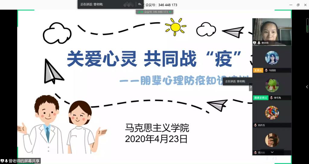 为密切了解同学们的心理状况,引导同学们保持阳光抗“疫”心态,以及为同学们开学后尽快适应学校生活做好准备,4月23日晚,马克思主义学院辅导员曾蓓老师通过腾讯会议组织开展了“关爱心灵,共同战疫”——朋辈心理防疫知识培训活动,各班心理委员、各年级朋辈心理互助员参加培训。