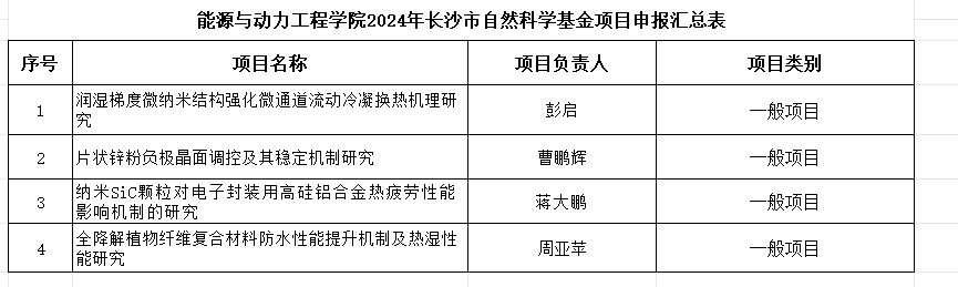 根据437必赢会员中心科学技术处《关于组织开展2024年度长沙市自然科学基金项目申报工作的通知》文件精神,经学院教授委员会专家评审,拟推荐“润湿梯度微纳米结构强化微通道流动冷凝换热机理研究”等4项项目申报2024年度长沙市自然科学基金项目,具体名单如下: