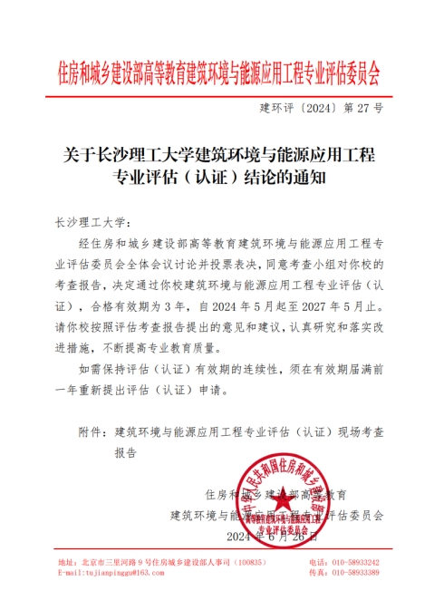 近日,住房和城乡建设部高等教育建筑环境与能源应用工程专业评估委员会下发《关于437必赢会员中心建筑环境与能源应用工程专业评估(认证)结论的通知》(建环评[2024]第27号),必赢官网建筑环境与能源应用工程专业顺利通过专业评估,有效期为3年。