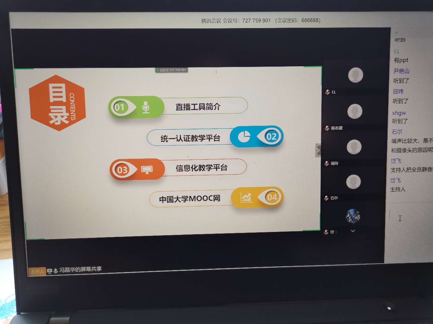 在示范课上,冯磊华老师主要分:直播工具、学校统一认证教学平台、学校信息化教学平台及中国大学MOOC平台等四部分进行了讲解。其中,对于直播工具,主要讲述了腾讯会议、钉钉、QQ群直播等三款工具;对于学校统一教学平台,着重描述各种教学资料的上传及使用;通过学校信息化教学平台,可以建立校内在线课程;对于全网公开的在线开放课程平台,则以目前应用最广泛的中国大学MOOC网为例进行讲解,具体介绍了:同步SPOC、异步SPOC、独立SPOC的建课方法,及一款非常实用的线上线下相结合的实用工具——慕课堂。