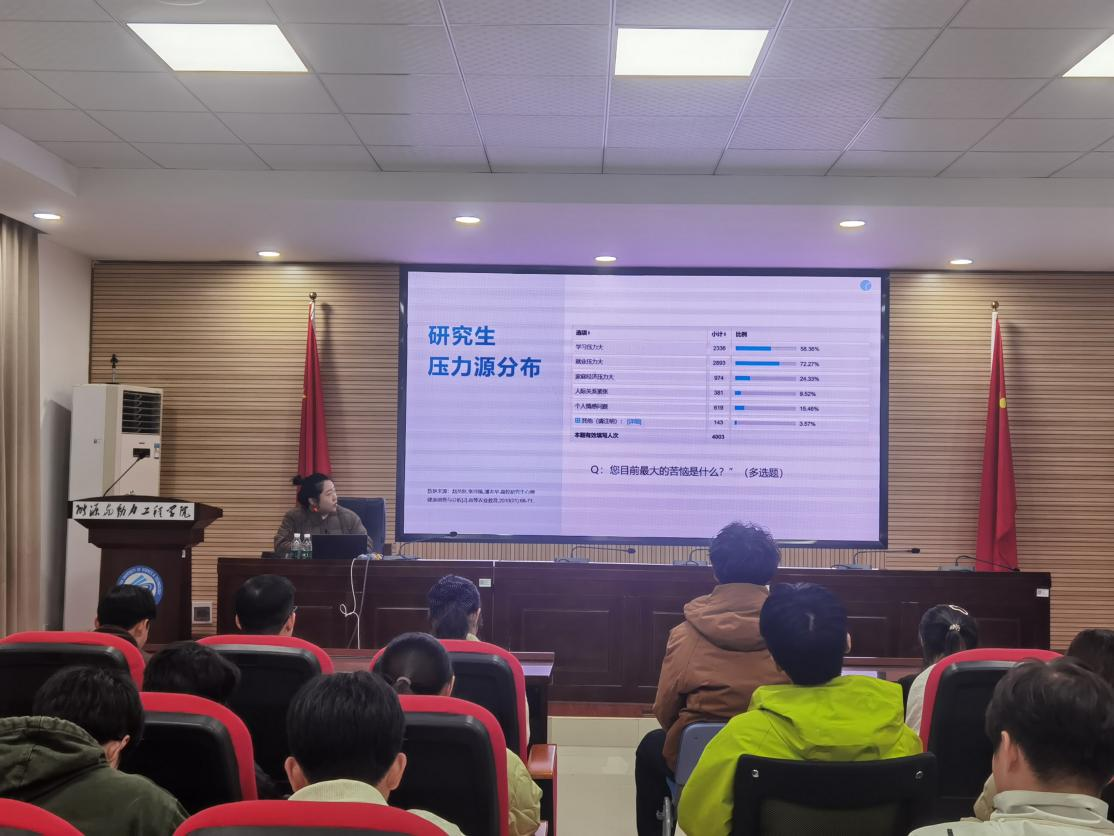 罗亦欧首先以“压力、情绪与自我”为主题分别从研究生心理健康状况、压力与心理健康、情绪管理三个方面进行详细讲解。通过学校2024年秋季研究生思想状况调研报告与研究生心理健康的相关论文中的数据,分析了当前社会研究生的心理健康状况;然后通过引入案例,解读了压力是什么及苦难教育给我们带来的压力,分析了长期压力的影响及应对压力的步骤;接下来讲述了如何认识、觉察情绪,通过引入一些情景模拟,穿插讲述了研究生如何缓解自己的情绪、自查心理状态。最后,罗亦欧为研究生提供了心理咨询的渠道,推荐了经典书籍和电影供同学们课后阅读和观影。