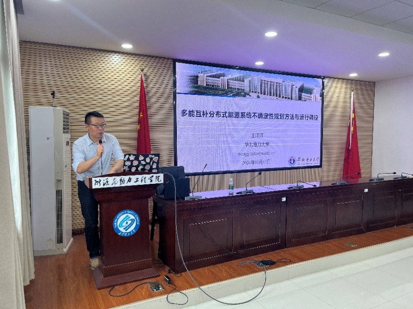 王江江教授发表了题为“多能互补分布式能源系统的不确定性规划方法与运行调控”的报告。他首先指出分布式能源与集中式能源融合是构筑未来清洁低碳、安全高效能源体系的发展方向,分析了其优劣势,并提出了协同规划与运行的技术路线。王教授从研究背景、热力学基础、随机与鲁棒规划等方面深入介绍了多能互补分布式能源系统的应用及实例,并分享了其团队在多能互补系统的热力学基础、源荷不确定性场景刻画与预测方法、分布式能源系统随机/鲁棒规划、平抑源荷波动的主动调控策略、多主体多用户的协同规划与运行及多能互补综合能源系统规划平台等关键技术与成果。这些内容为在场的师生提供了宝贵的学术经验和启示。报告结束后,我院师生积极与王教授进行了深入的交流和讨论,现场气氛热烈,学术氛围浓厚。