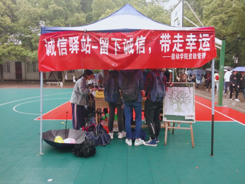 活动伊始,资助部干事分别在两个活动地点搭帐篷,准备活动所需物资。通过活动前期宣传而了解本次活动的同学纷纷来到摆点处参与本次活动。资助部共准备了5项游戏,同学们通过说说集赞和玩游戏的形式获得诚信印章,最后凭借诚信印章数量进行奖品兑换。同时,资助部制作了诚信大树,参与活动的同学可以在诚信大树上用染料画上属于自己的树叶并签名、合影留念。