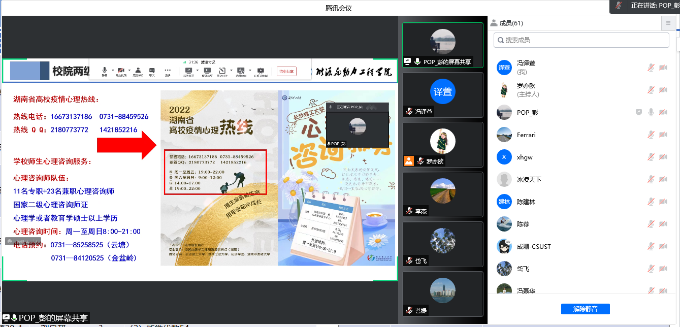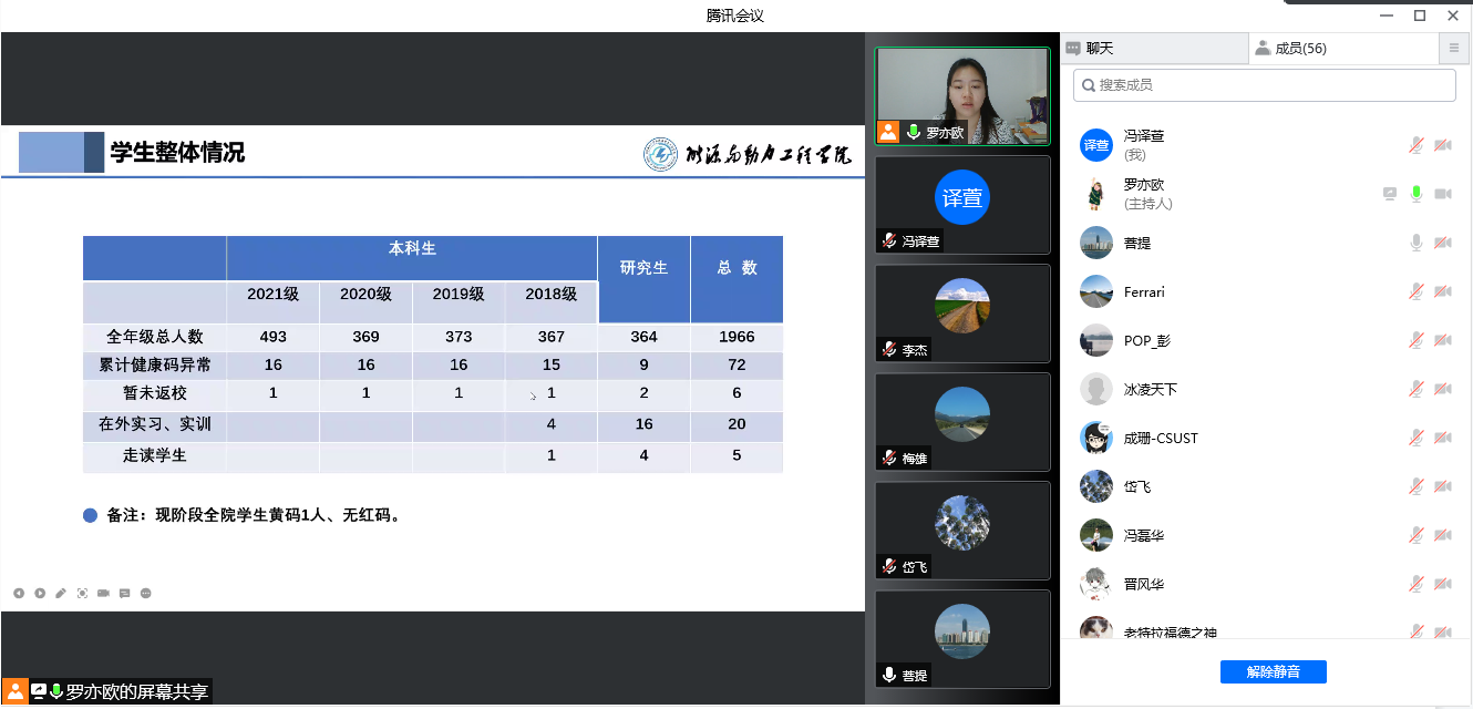 首先,由罗亦欧介绍全院学生基本情况,包括在校人数、黄红码情况、疫苗注射情况等,介绍学院疫情防控政策。随后,罗亦欧与胡雅妮分别就本科生群体、研究生群体从疫情防控、学风、日常养成管理三个方面向全体与会老师汇报各自群体开展工作中的难点与重点、采取的主要措施,最后,向全体老师们提出新的工作要求。接着,心理辅导员彭博向老师们介绍因疫情封校,同学们可能存在的心理问题,并详细推介了校、院两级的心理援助资源。会上,孙小琴强调,导师在研究生学习、生活的过程中,扮演着重要的角色,有效沟通可以使工作开展事半功倍,呼吁老师们多深入工作室、寝室。