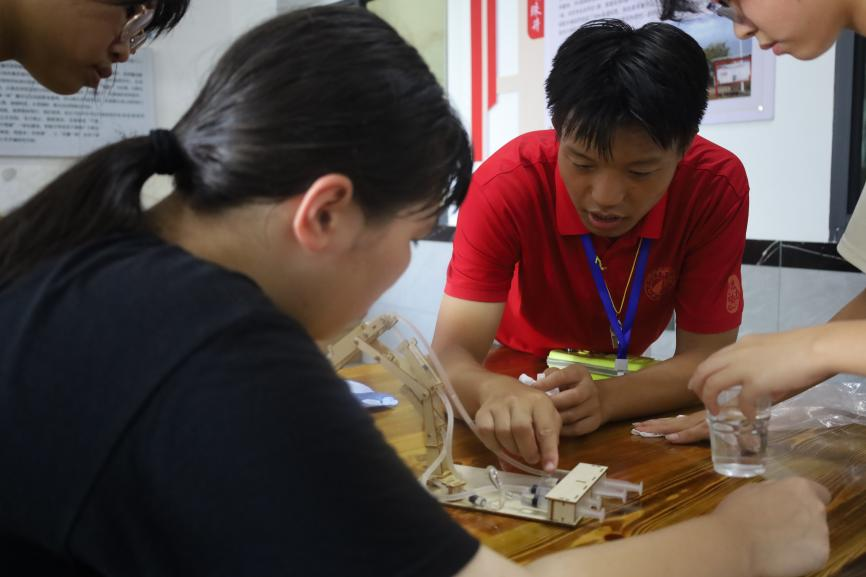 在动手实践环节,孩子们分组化身为“小小工程师”,在肖鹏指导下,利用注射器(模拟液压泵)、软管、连接件和支架等材料,动手组装液压机械臂模型。肖鹏强调着操作要点:确保软管连接紧密以防泄漏,稳固基座以保证机械臂稳定。孩子们全神贯注,小心翼翼地拼接部件、固定接口、注入工作液体。当看到自己亲手组装的机械臂,通过推动小小的注射器就能操控“手臂”升降时,成功的喜悦洋溢在每个人的脸上,对液压传动力量放大的原理也有了最真切的体会。