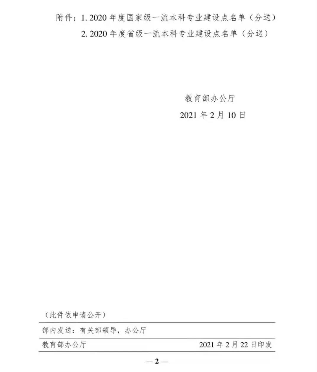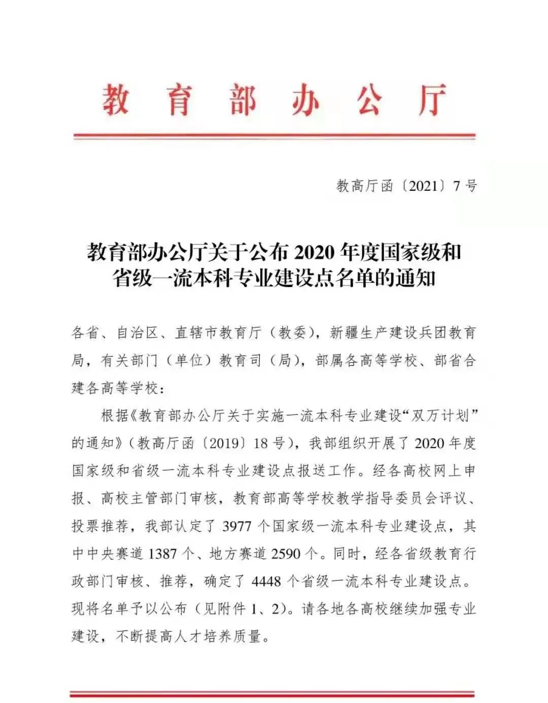 2021年2月10日,教育部办公厅发布了《关于公布2020年度国家级和省级一流本科专业建设点名单的通知》,认定了3977个国家级一流本科专业建设点,其中中央赛道1387个、地方赛道2590个。
