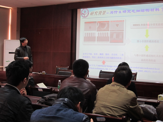 受聘仪式结束后,廖强教授作了一场精彩的学术报告。报告题目为《毛细结构材料内两相流动及相变换热实验与理论模型》。能动学院师生共120多人聆听了廖教授的报告。与会师生感到受益匪浅。