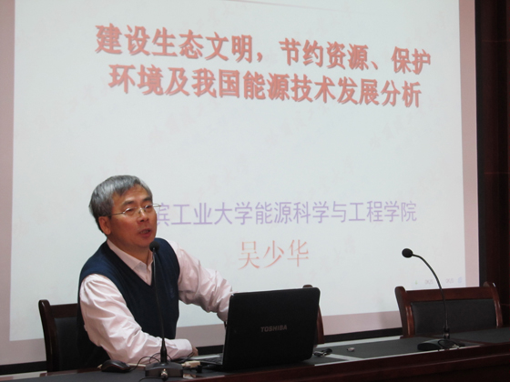 受聘仪式结束后,吴少华教授作了一场精彩的学术报告。报告主题为“建设生态文明、节约资源、保护环境及我国能源技术发展分析”。能动学院师生及特邀来宾长沙市能源局缪晨光局长一行、长沙市发改委环资处领导共120多人聆听了吴教授的报告。