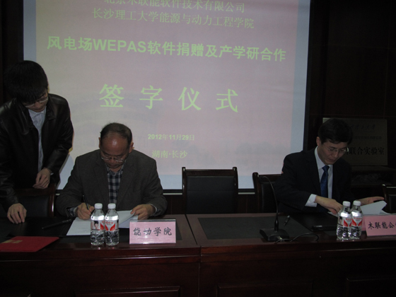 签字仪式上,能动学院院长陈冬林教授首先致欢迎词,他代表能动学院对北京木联能软件技术有限公司总经理李伟宏一行表示热烈欢迎,对北京木联能软件技术有限公司给学院办学的支持表示衷心的感谢,同时介绍了学院办学的基本情况和双方合作的方向;李伟宏总经理介绍了北京木联能软件技术有限公司在风电软件开发方面取得的业绩,希望双方能整合资源,发挥优势,切实推进风电人才培养和产学研合作。