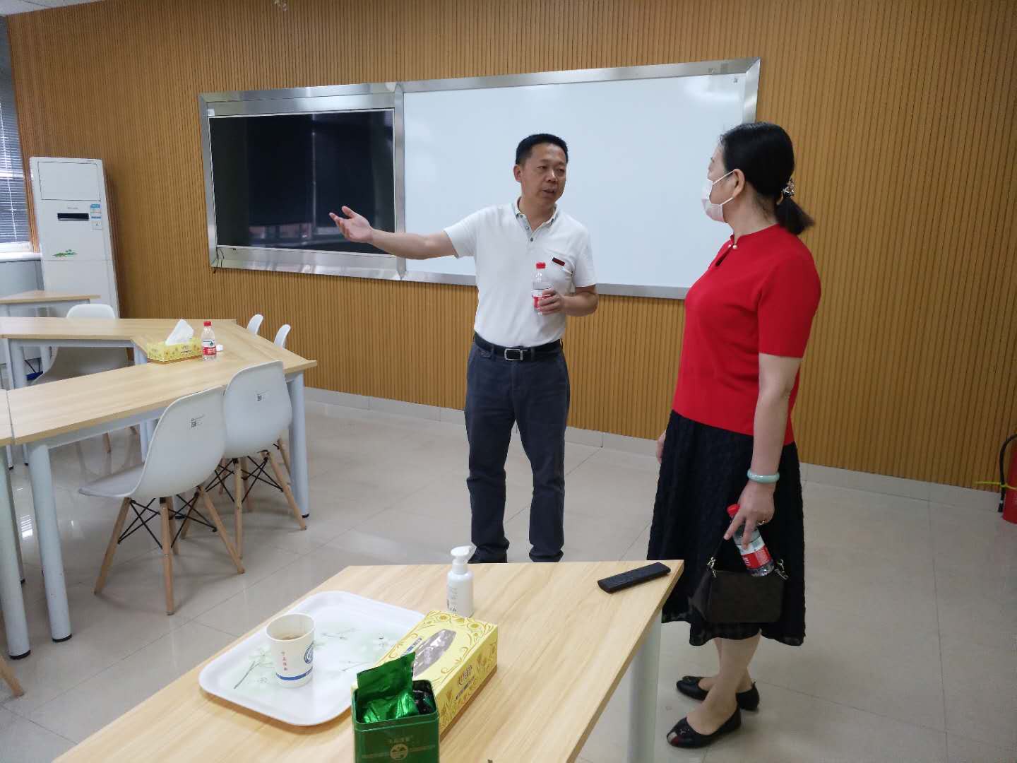 赵爱群一行首先参观了学院文化墙、一站式服务办公室、科研工作室、会议室、行政办公区宿舍等,了解学院“职工小家”建设情况。杜荣华全程陪同并详细介绍了关于学院“职工小家”创建历程和未来发展规划情况。校工会对学院“职工小家”目前的创建工作给予了充分肯定,学院将“家文化”融入学院育人工作之中,大大提高学习和工作效率,让广大师生感受到浓浓的服务氛围。