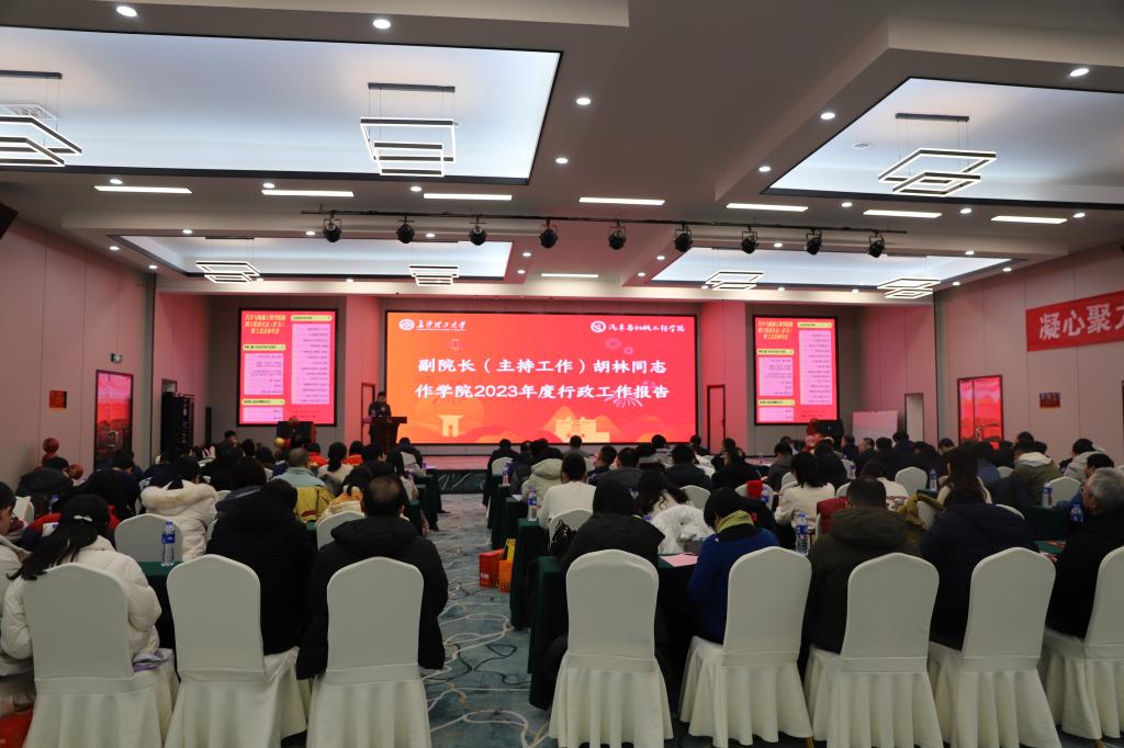 在雄壮的国歌声中,学院党委副书记兼副院长唐宏宾宣布大会开幕。副院长(主持工作)胡林作2023年度学院行政工作报告,总结了学院本年度取得的成绩,并将绩效分配方案提请会议审议学院工会主席尹来容作了工会年度工作报告及财务工作报告。会议通过了学院行政工作报告、学院工会工作报告、工会财务报告和工资及绩效分配实施办法等决议。会上,还为近期离退休老同志举办了荣休仪式。学院党委书记施一满在总结讲话中出,要深刻领会学院快速发展的重要意义,明确发展是永恒的主题,是学院不断壮大的不二法门,是促进个人发展、提升幸福感最重要路径;要明确坚持党建引领,加强制度建设和文化建设是学院快速发展的路径选择。