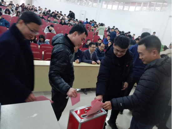 总监票人徐小林同志主持选举程序。向参会代表展示检验票箱,工作人员向全体参会代表发放选票并宣读选票填写说明。全体到会党员代表认真填写选票,投出庄严神圣的一票。投票结束,由监票人监督,计票人开箱清点回收选票。由总监票人徐小林同志现场报告了计票结果,丁玉龙等9名候选人正式当选学校第四次党代会代表。