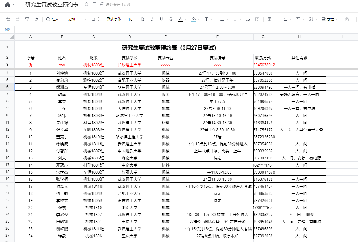 全院共征集15个房间用于研究生线上复试,涵盖会议室、系部教研室、教师工作室、团体辅导室、个体辅导室、社区工作室等场所,场地内桌椅、三脚架等设备配置齐全,并定期进行消杀清洁。同时,还成立专门的复试志愿者团队,通过建立QQ群、收集在线表格,协调场地使用时间,一对一服务复试同学,做到场地使用效率最大化,让同学复试体验最优化,为复试顺利进行保驾护航。目前,已供应全院81人次的使用。