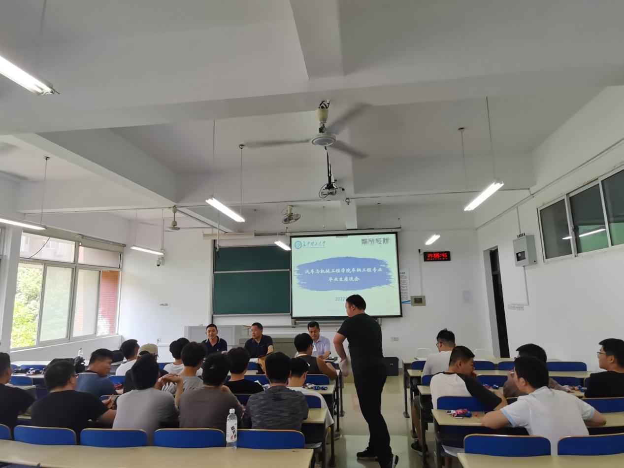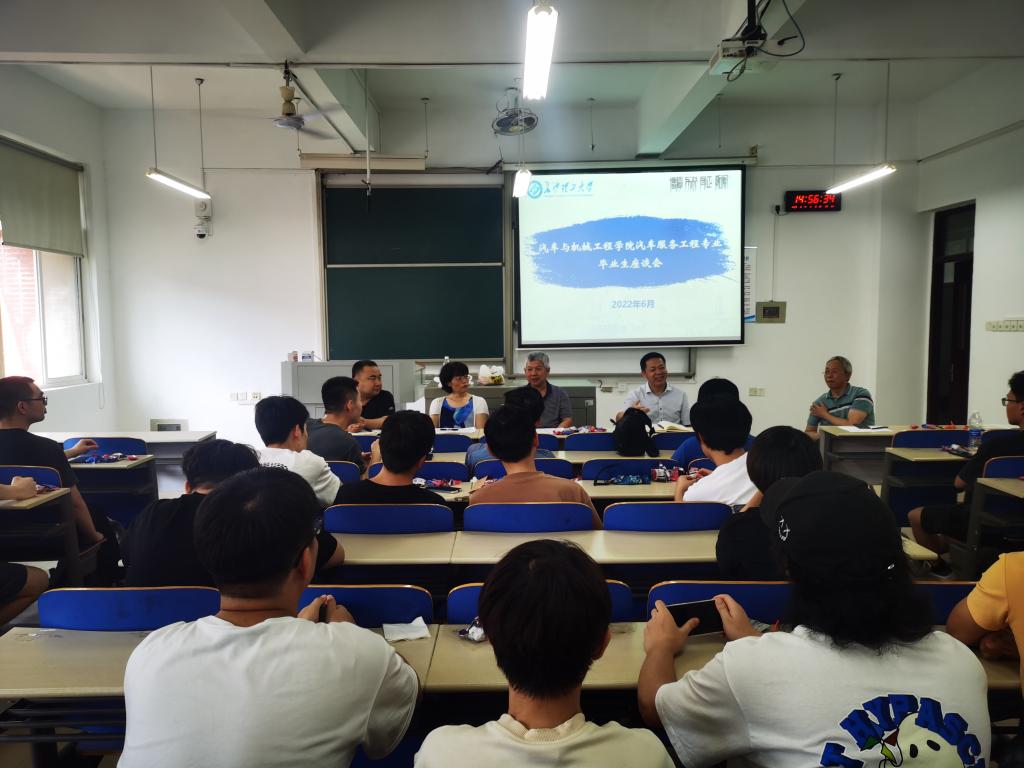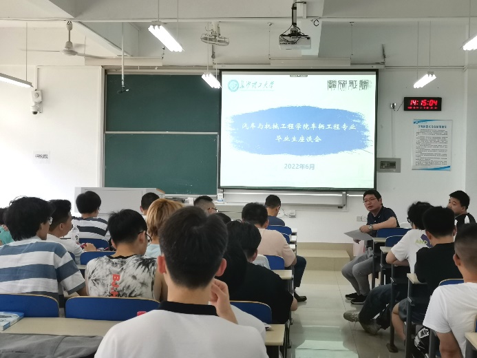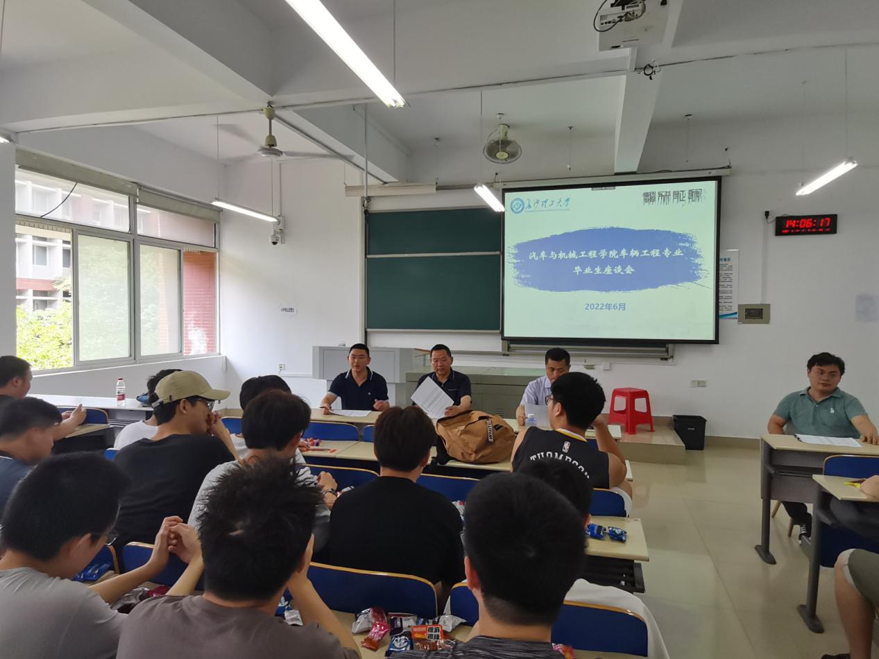 6月14日下午,我院在工科一号楼B205-B209教室召开了2022届车辆工程和汽车服务工程专业毕业生座谈会,活动按照专业班级共设立五个分会场,分别由吴钢、伍文广、王方、张旭、刘鹏主持会议。学院党委书记施一满、院长杜荣华、副书记唐宏宾、副院长胡林,汽车工程系全体教师、辅导员路平安、蔡翔宇,及车辆工程和汽车服务工程专业全体毕业生参加了此次座谈会。