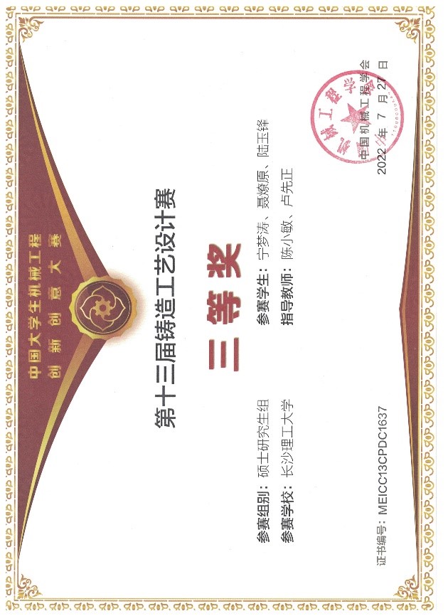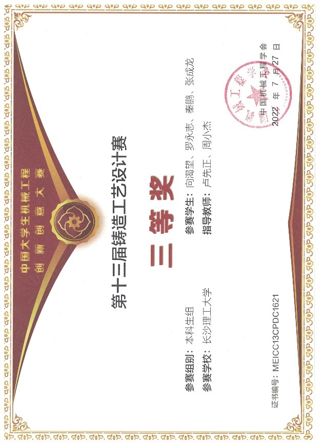 由中国机械工程学会主办,中国机械工程学会铸造分会承办的“2022中国大学生机械工程创新创意大赛专业赛项:第十三届铸造工艺设计赛”,经过2022年3月的校内选拔赛和2022年4月的线上全国决赛初评,于2022年7月2-5日在山西省高平市大酒店成功举办了全国决赛终评会议,最终产生了一等奖 、二等奖及全部三等奖获奖作品名单。必赢官网属首次参赛,同学们参赛积极性很高,组建了2组研究生队伍和20组本科生队伍,参赛人数达80余人,经过校内选拔赛的筛选及全国决赛的初评和终评,最终有4组队伍荣获全国三等奖,具体获奖名单如下。
