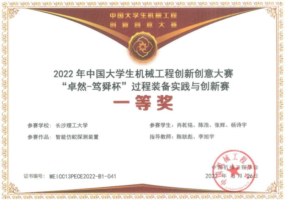 智能仿蛇探测装置项目一等奖获奖证书