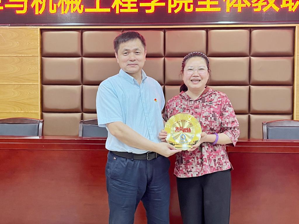 会上,施一满组织开展了教师荣休仪式。施一满为教务办主任李朝晖老师颁发“光荣退休”牌匾并合影留念,感谢她对学院工作的辛勤付出,希望退休以后一如既往地支持学院工作,为学院建设发展献言建策。同时,向全体教职工介绍了新进的博士及新上任的教务办主任,两位老师分别表态发言。