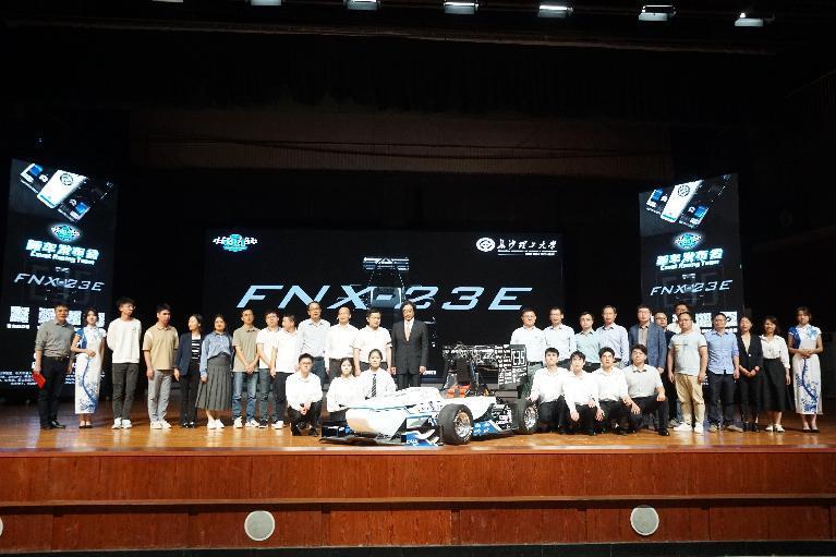 典礼上,还进行了2023年度437必赢会员中心方程式赛车队的新车发布仪式,车队队长张博轩对车队的成长历程进行了介绍,并对今年制造的新车FNX-23E进行了详细的技术介绍。汽机学院党委书记施一满、副院长(主持工作)胡林、车队指导老师伍文广、队长张博轩共同为新车揭幕。