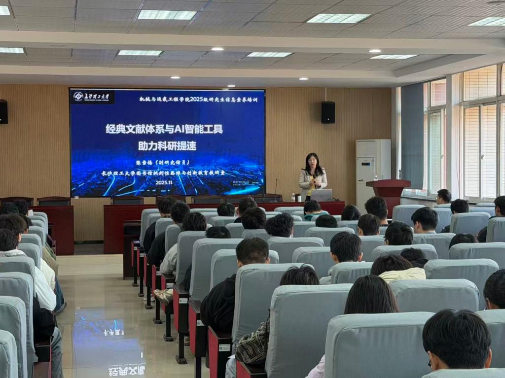 2025年11月25日下午16:00,学院新生入学教育系列活动迎来重要一课。图书馆资深馆员张雪梅老师受邀担任主讲嘉宾,为学院研究生新生们带来《经典文献体系与AI智能工具助力科研提速》专题报告。