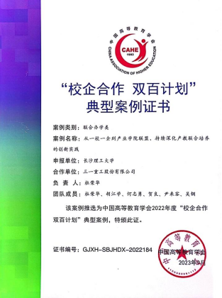 在本届高等教育博览会上,我院联合三一重工股份有限公司联合申报的《从一校一企到产业学院联盟,持续深化产教联合培养的创新实践》联合办学类案例入选2022年度中国高等教育学会“校企合作 双百计划”典型案例。