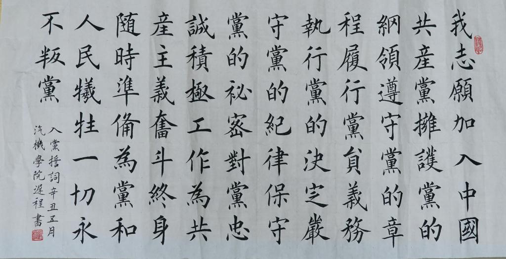 5月中下旬,汽车与机械工程学院组织开展以“不忘初心学党史,挥毫泼墨写党章”为主题的书画展活动,各年级学生积极参加。