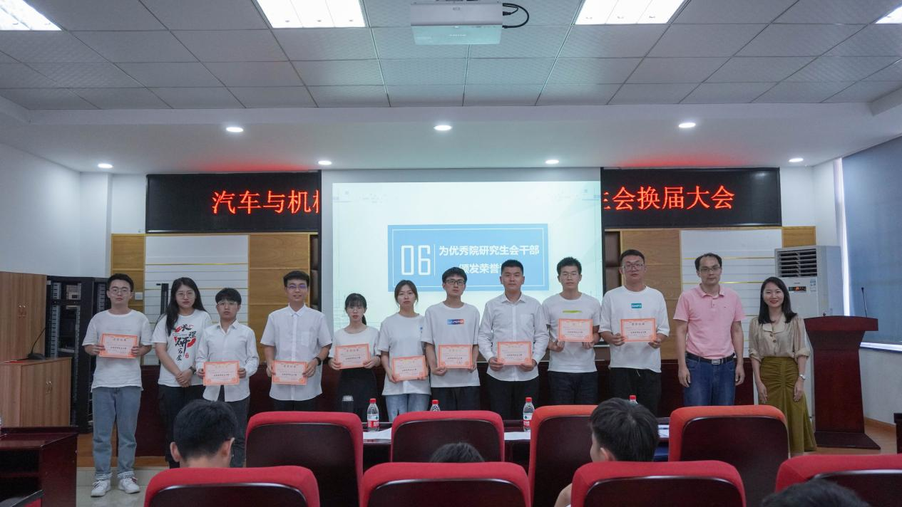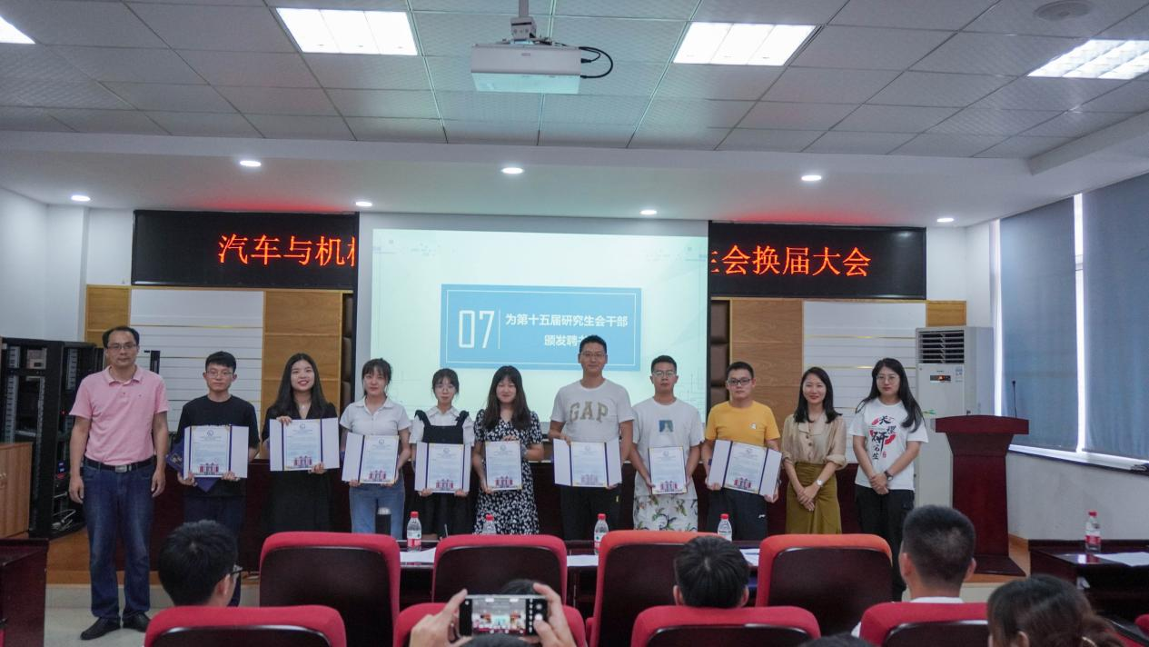 之后,大会公布了优秀研究生会干部名单,由唐宏宾副书记、辅导员宋新和校研会代表李心怡上台为获奖人员现场颁发荣誉证书,并为上一届研究生会干部颁发了任职证书。会议最后,研会各成员进行合影留念。本次会议的圆满结束为研究生会注入了新的活力,为接下来研究生会工作的顺利有序开展奠定了基础。新一届研究生会成员也纷纷表示,将不负众望,以饱满的热情投入到接下来的工作当中,为学院出谋划策,为研究生会工作尽自己最大的努力。