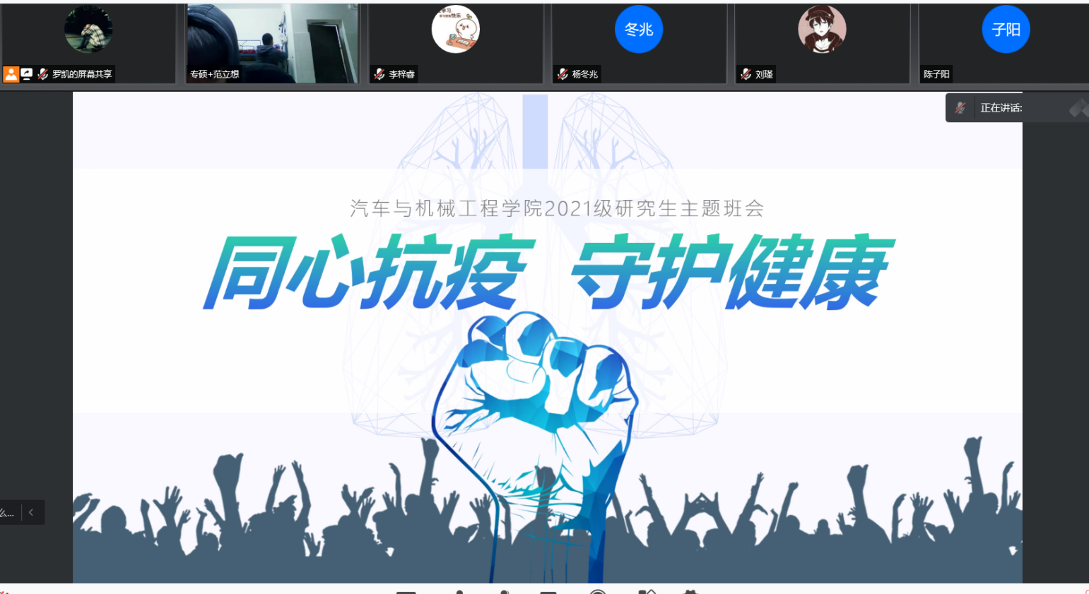 为了进一步保障研究生安全稳定,落实疫情防控相关要求,10月31日晚,汽机学院研究生辅导员宋新组织各年级召开“同心抗疫,守护健康”主题班会。