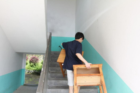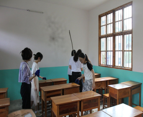 另一组成员前往青围希望学校进行卫生打扫与桌椅摆放。由于青围村地广人稀,学生人数较少,学校闲置已久,所以桌椅落满了灰尘,团队成员打扫过程推进得较为缓慢,历经数小时的努力,成员们终于将教室打扫得焕然一新。