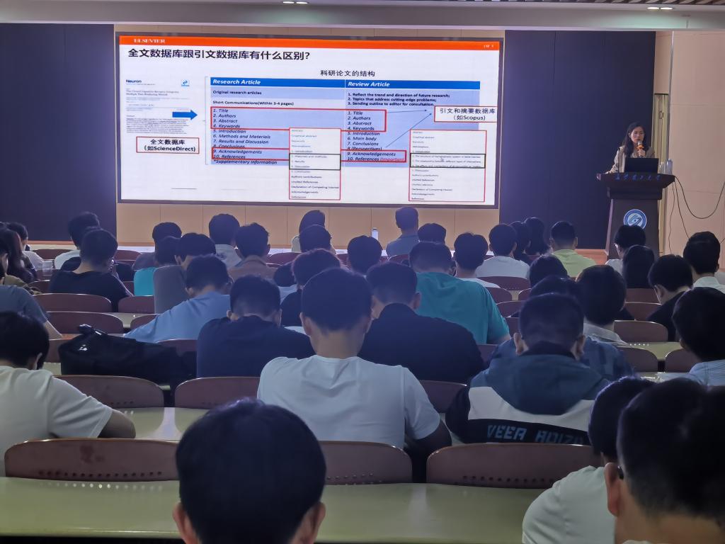 “过去12个月最受长理师生关注的Science Direct期刊是什么?”、“汽车工程领域、机械工程领域大家知道如何快速检索有效信息吗?”一个个引人入胜的问题开启了这场讲座。许靖博士从如何快速地检索英文文献、如何阅读参考文献、如何将方法运用到自己的课题中去三个方面详细的讲解了高校科研的技巧和诀窍。看到台上同学聆听疑惑之处,许靖博士以互动的形式进一步为同学们答疑解惑。副研究馆员张雪梅随后为在场同学带来分享了图书馆大量实用性极强的学术论文检索网站以及使用的方法,让同学们了解途径轻松获取学术资源,高效助力学术科研。