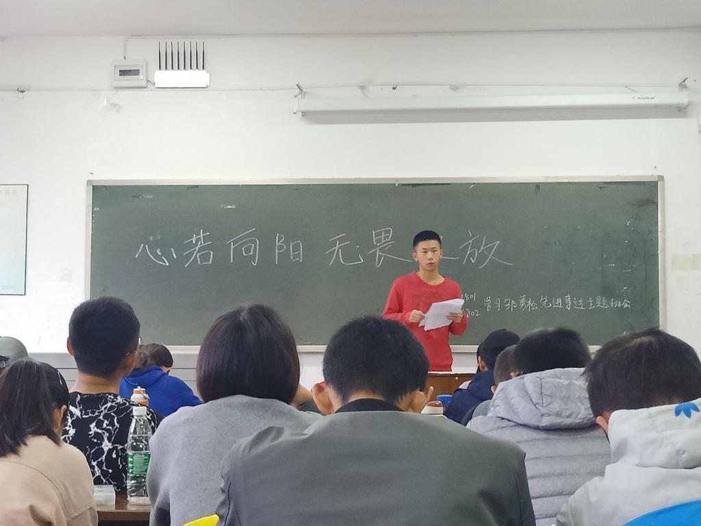为了培养新生具有爱国、奉献、乐观积极的精神,10月16日学校特意组织2018级新生参加邹永松先进事迹报告会。为了进一步增强意识,坚定信念,我院于10月17日早上7点在金盆岭校区12号教学各班自习室召开“心若向阳,无畏绽放---学习邹永松先进事迹”主题班会,全体2018级学生参加.