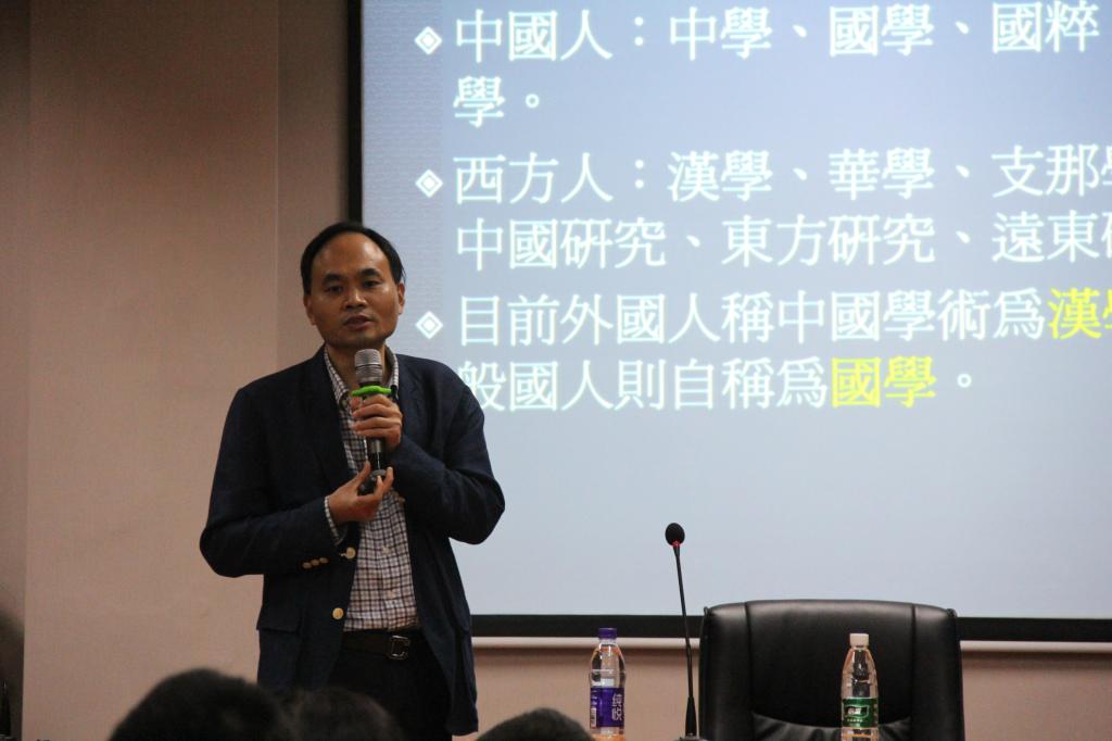 讲座伊始,颜建华教授以中国人与西方人对国学的异称为导线,引出何为国学,并通过列举章太炎、吴宓、邓实等古代学士对国学的理解,进一步加深了同学们的认识。接着,颜教授从国学的组成部分和分类方式对国学进行剖析,并着重讲解了经、史、子、集这四个国学的重要部分。传授学生们如何辨别小学、国学、经学这几个概念。为了提升学生们的对国学的学习兴趣和理解,颜教授还为同学们推荐了《论语译注》等几本与国学有关的著作。