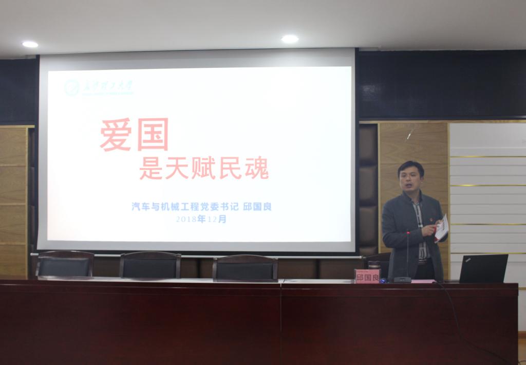 2018年12月4日晚7点20,汽机学院于云塘校区工一B417开展第八期青马班第一课,汽机学院党委书记邱国良为第八期青马班学员员讲解“爱国是天赋民魂”。