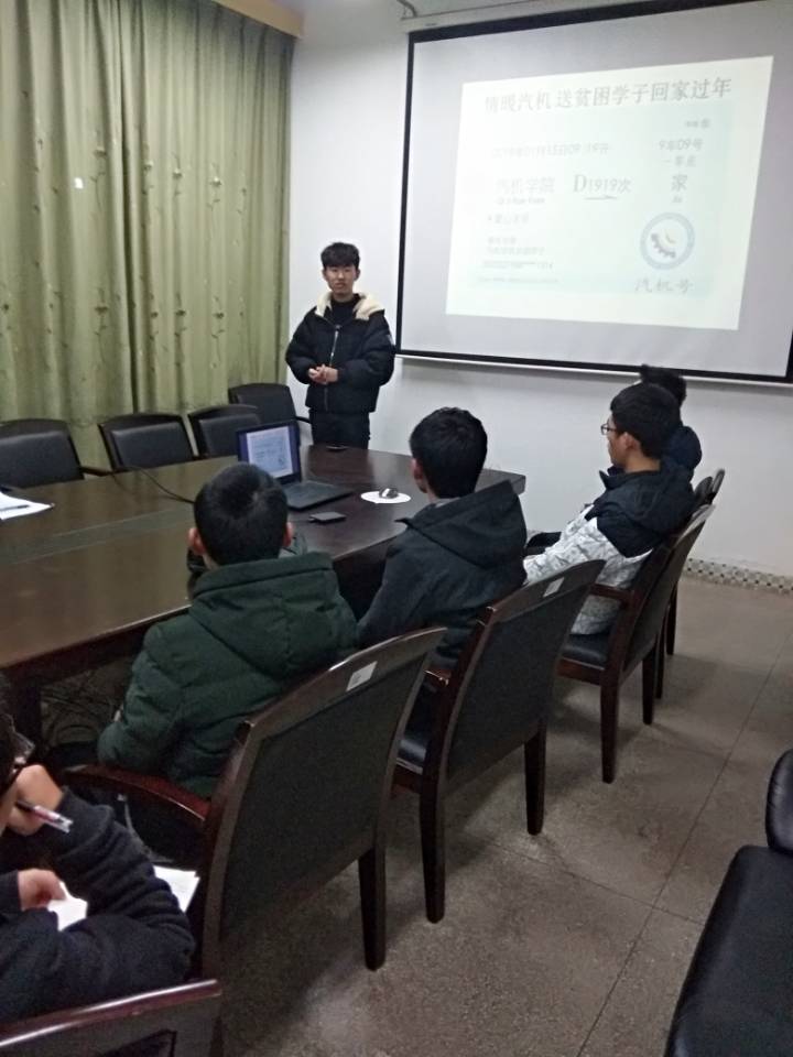 2019年1月16日晚8点,汽机学院于金盆岭校区9教430组织开展“情暖汽机,送贫困学子回家过年”主题资助活动。活动由资助辅导员路平安主持,全体2018级生活委员参加。
