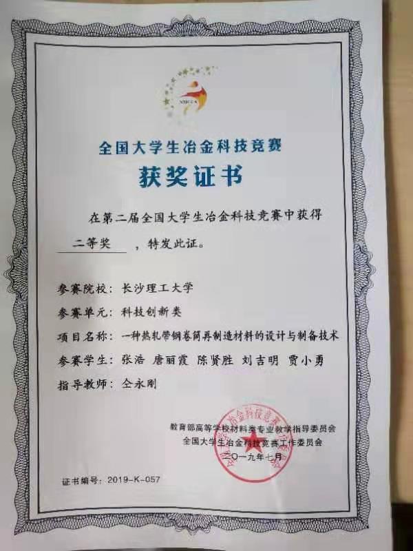 必赢官网先进制造工艺与高性能材料研究团队仝永刚老师指导,汽车与机械工程学院张浩、唐丽霞、陈贤胜、刘吉明、贾小勇、柏林辉、潘婧、肖昂、谢天易、马伟刚等10位学子组成两支参赛队伍,提交的作品:“一种热轧带钢卷筒再制造材料的设计与制备技术”与“一种大尺寸难熔高熵合金的成型方法”分别荣获了科技创新类竞赛全国二等奖和三等奖。(文/彭琼英 图/华熳煜 审/华熳煜)