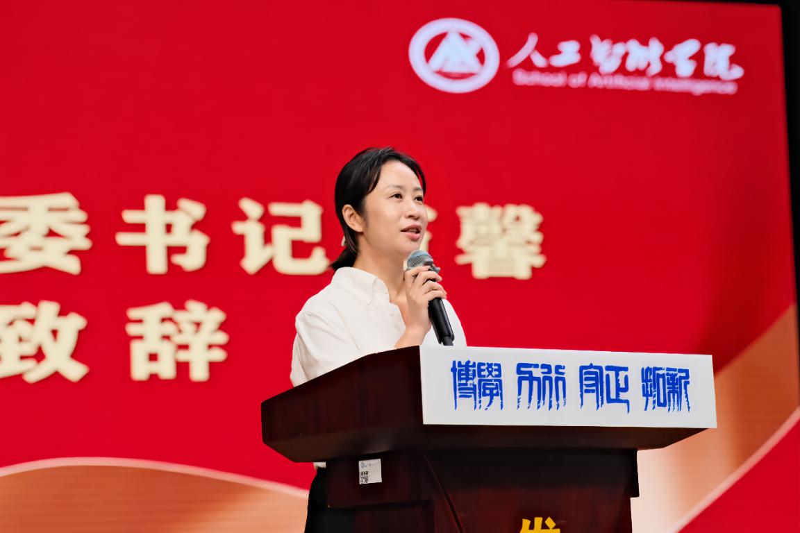 典礼伊始,全体师生奏唱国歌。万馨代表全体师生,向来自全国各省市的637新生致欢迎词,并向为新生成长倾注心血的父母、师长表达诚挚感谢。她结合全球人工智能领域的前沿趋势、社会需求,以及学院科研团队的真实案例,深刻阐述了同学们肩负的时代使命,并送出“扎深基础、拓宽视野、放平心态”三句箴言,勉励全体新生坚守科技向善的初心。