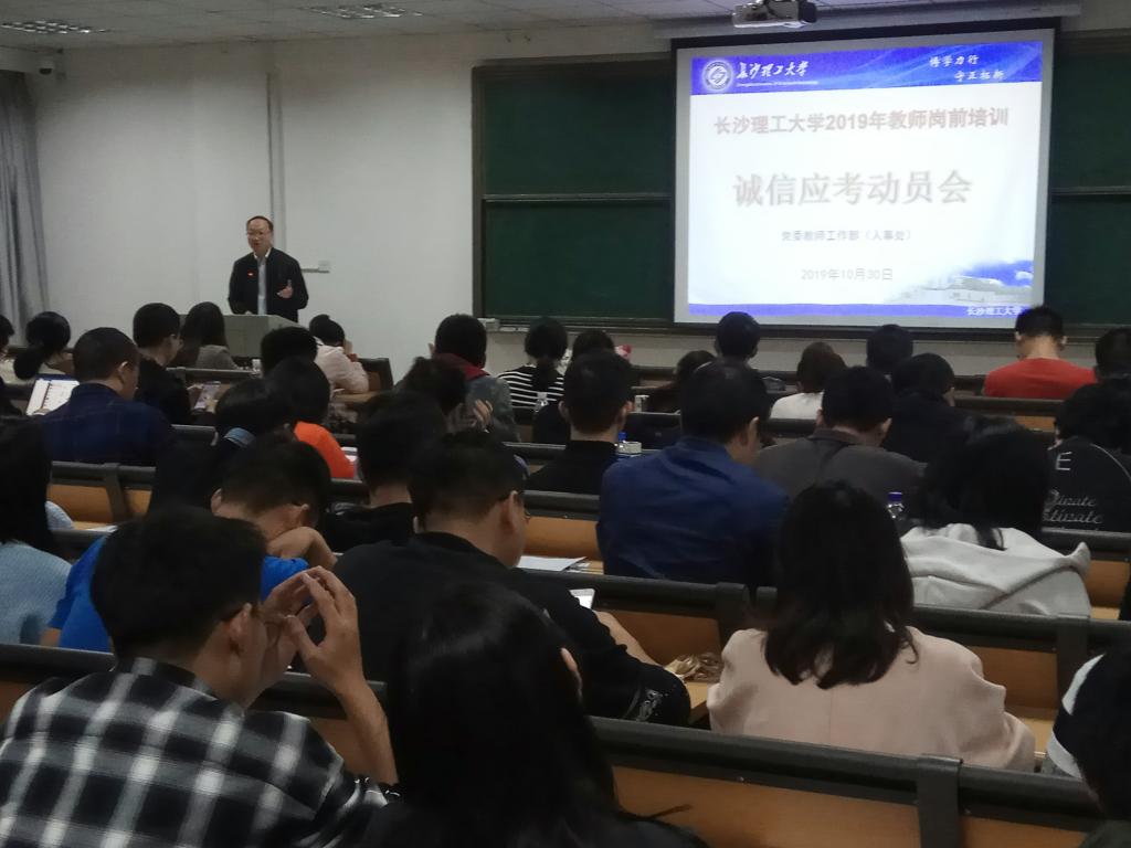 2019年10月30日晚,必赢官网在金盆岭校区4教507召开了2019年岗前培训考试诚信应考动员会,培训班全体学员和人事处有关工作人员参加。动员会由人事处副处长徐欣国主持。