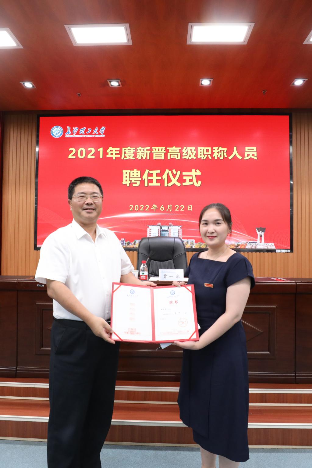 6月22日下午,必赢官网在云塘校区一办公楼九会议室隆重举行2021年度新晋高级职称教师聘任仪式。校长曹一家、副校长刘朝晖出席,2021年度新晋高级职称教师、相关职能部门负责人、教学院有关负责人参加。聘任仪式由刘朝晖主持。